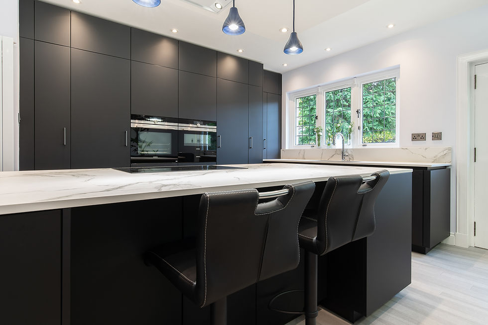 The request for something contemporary led the clients to opt for a black and white kitchen, which is striking and works well in the space available. Soft touch matt black doors with contrasting matt Dekton Aura worktops gave it a very sleek look.